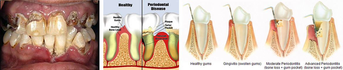Dalam Periodontitis, racun bakteri kronis memunculkan suatu respon inflamasi dari tubuh, menyebabkan keropos tulang. Lampiran pada gusi dengan gigi rusak, tulang yang mendukung gigi hancur, dan membentuk kantung bakteri pelabuhan mana dan dengan produk. Sebagai penyakit berlangsung, memperdalam kantong dan jaringan gusi lebih dan tulang yang hancur. Seringkali, proses destruktif memiliki gejala yang sangat ringan. Akhirnya, gigi dapat menjadi longgar dan mungkin harus dihapus.